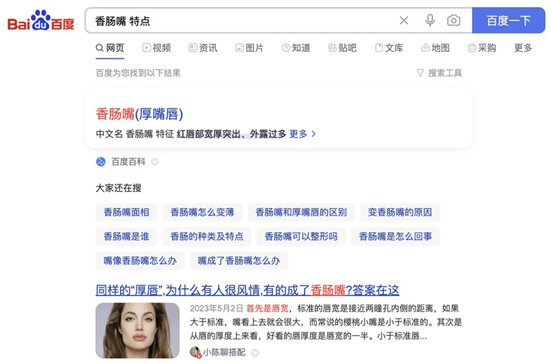 什么是搜盡奇峰打草稿?說通俗一點(diǎn),就是找參考,總結(jié)規(guī)律、找到特點(diǎn),然后用在自己的設(shè)計當(dāng)中。搜盡奇峰打草稿最簡單的方式是什么?只要你在百度的搜索框里面打上這個問題的關(guān)鍵詞,如“香腸嘴特點(diǎn)”,就能搜索出多個特點(diǎn)。