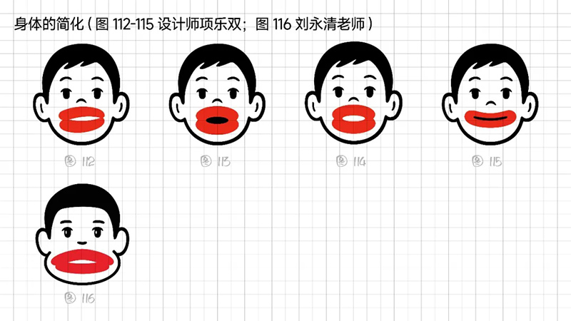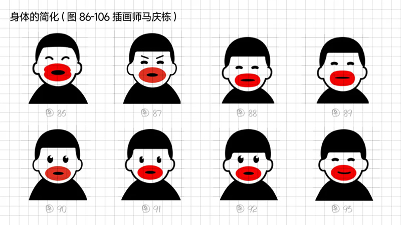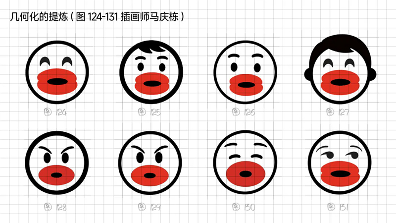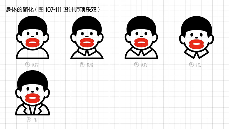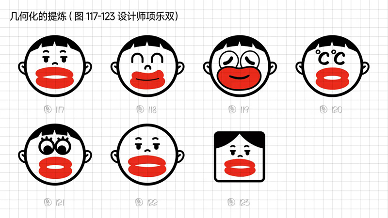 4)去外輪廓的改變:堅持簡化思路,那能不能更加簡練呢?可以把能識別出臉?biāo)性睾喕⑻摶⑸踔羷h除嗎?嘗試只保留眼睛、眉毛、嘴巴,就能識別。但是去掉外輪廓的表現(xiàn)手法,會使得整體圖形顯得散。