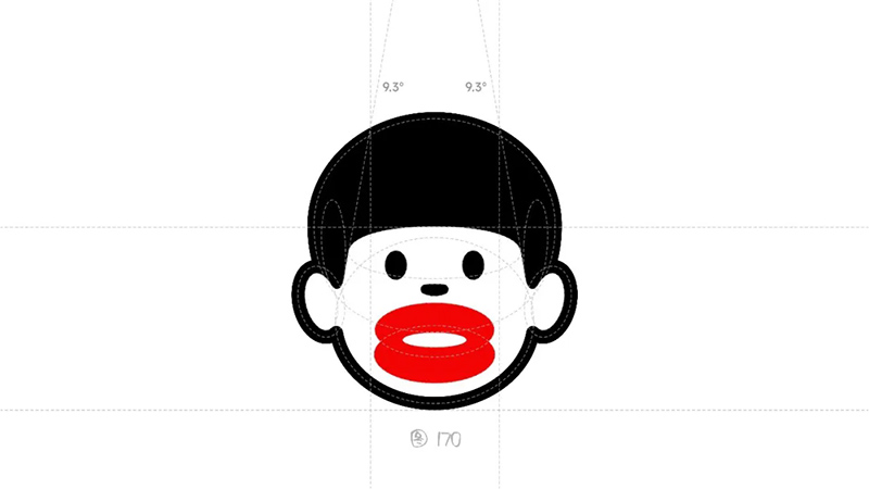 6)調(diào)整比例與簡化細(xì)節(jié):事情的結(jié)果總是不知不覺中就出現(xiàn)了,把頭發(fā)用最簡單的表現(xiàn)形式——平劉海跟燙嘴哥相結(jié)合,頭發(fā)形成一個幾何面,與嘴唇在圖形配重就能達(dá)到平衡,整體輪廓線條等粗,眼睛的2個橢圓點(diǎn)畫龍點(diǎn)睛。